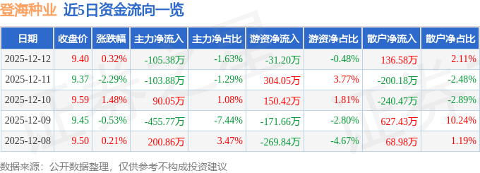 证券之星消息,截至2025年12月12日收盘,登海种业(002041)报收于9.4元,上涨0.32%,换手率0.78%,成交量6.89万手,成交额6483.58万元。