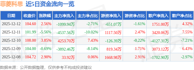 证券之星消息,截至2025年12月12日收盘,菲菱科思(301191)报收于104.6元,上涨2.56%,换手率7.45%,成交量3.89万手,成交额4.06亿元。