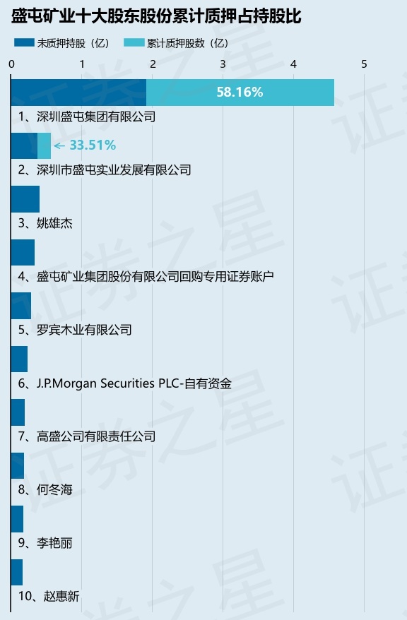 截止本公告日,股东深圳盛屯集团有限公司已累计质押股份2.66亿股,占其持股总数的58.16%,股东深圳市盛屯实业发展有限公司已累计质押股份1910.0万股,占其持股总数的33.51%。本次质押后盛屯矿业十大股东的累计质押股份占持股比例(占持股比例的计算以公司最新一期财务报表公布的十大股东的持股总数为基准)见下图: