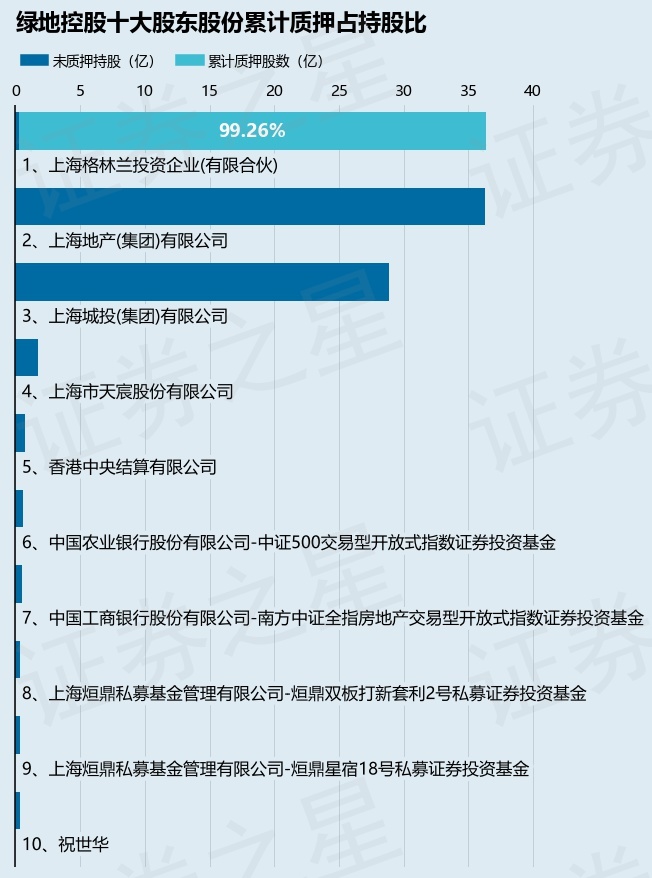 截止本公告日,股东上海格林兰投资企业(有限合伙)已累计质押股份36.11亿股,占其持股总数的99.26%。本次质押后绿地控股十大股东的累计质押股份占持股比例(占持股比例的计算以公司最新一期财务报表公布的十大股东的持股总数为基准)见下图: