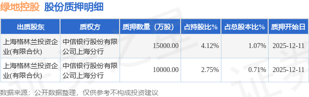 证券之星消息,绿地控股(600606)12月13日公开信息显示,股东上海格林兰投资企业(有限合伙)向中信银行股份有限公司上海分行合计质押2.5亿股,占总股本1.78%。质押详情见下表: