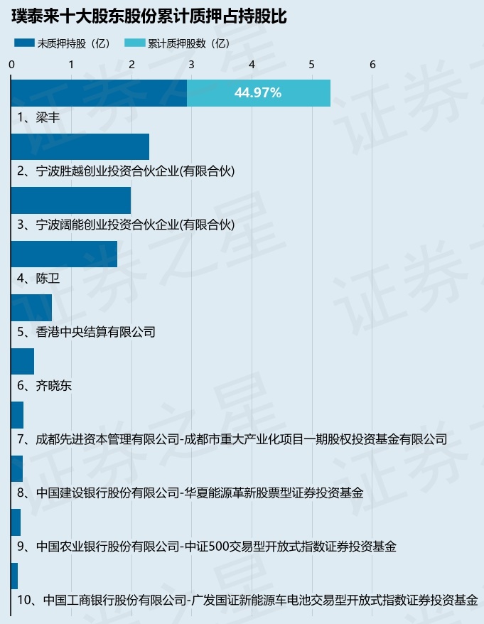 截止本公告日,股东梁丰已累计质押股份2.39亿股,占其持股总数的44.97%。本次质押后璞泰来十大股东的累计质押股份占持股比例(占持股比例的计算以公司最新一期财务报表公布的十大股东的持股总数为基准)见下图: