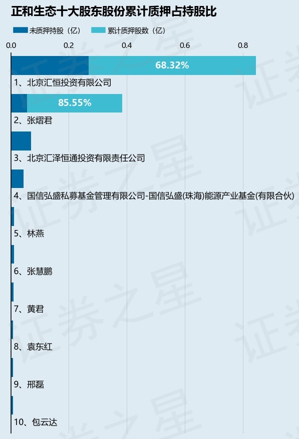 截止本公告日,股东北京汇恒投资有限公司已累计质押股份5778.49万股,占其持股总数的68.32%,股东张熠君已累计质押股份3290.0万股,占其持股总数的85.55%。本次质押后正和生态十大股东的累计质押股份占持股比例(占持股比例的计算以公司最新一期财务报表公布的十大股东的持股总数为基准)见下图: