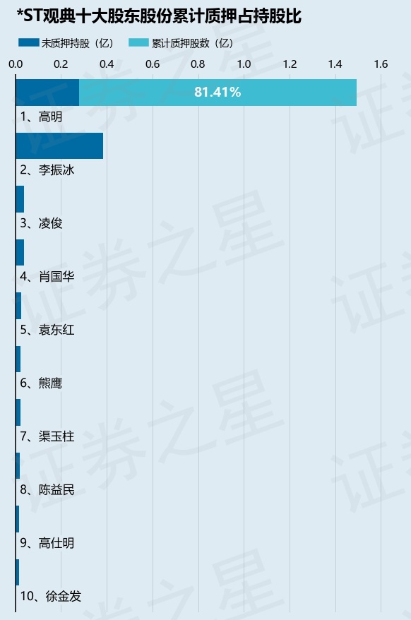 截止本公告日,股东高明已累计质押股份1.22亿股,占其持股总数的81.41%。本次质押后*ST观典十大股东的累计质押股份占持股比例(占持股比例的计算以公司最新一期财务报表公布的十大股东的持股总数为基准)见下图: