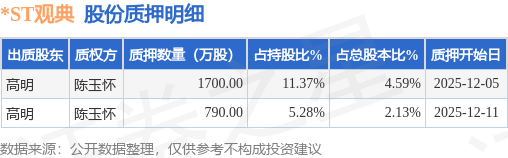 证券之星消息,*ST观典(688287)12月13日公开信息显示,股东高明向陈玉怀合计质押2490.0万股,占总股本6.72%。质押详情见下表: