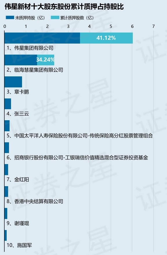 截止本公告日,股东伟星集团有限公司已累计质押股份2.48亿股,占其持股总数的41.12%,股东临海慧星集团有限公司已累计质押股份8000.0万股,占其持股总数的34.24%。本次质押后伟星新材十大股东的累计质押股份占持股比例(占持股比例的计算以公司最新一期财务报表公布的十大股东的持股总数为基准)见下图: