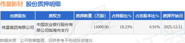 证券之星消息,伟星新材(002372)12月13日公开信息显示,股东伟星集团有限公司向中国农业银行股份有限公司临海市支行合计质押1.1亿股,占总股本6.91%。质押详情见下表: