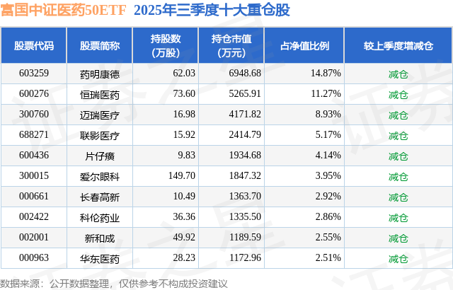 富国中证医药50ETF基金成立于2020年3月16日,基金经理为王乐乐,基金跟踪标的为中证医药50指数,成立以来超额回报为19.89%,近一个月超额回报为0.37%。最新披露的基金持仓数据显示,截止2025年9月30日,该基金第一大重仓股为药明康德(603259),持股占比为14.87%。