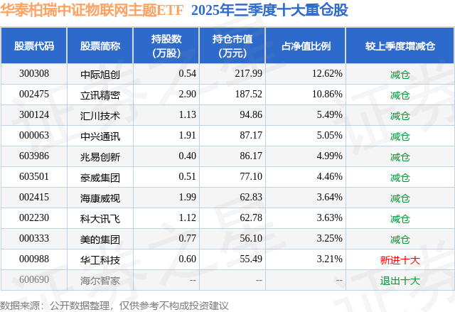 华泰柏瑞中证物联网主题ETF基金成立于2021年3月31日,基金经理为李茜,基金跟踪标的为中证物联网主题指数,成立以来超额回报为-0.75%,近一个月超额回报为0.19%。最新披露的基金持仓数据显示,截止2025年9月30日,该基金第一大重仓股为中际旭创(300308),持股占比为12.62%。
