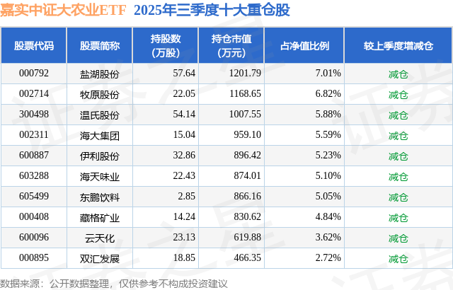 嘉实中证大农业ETF基金成立于2021年3月30日,基金经理为李直,基金跟踪标的为中证大农业指数,成立以来超额回报为5.79%,近一个月超额回报为0.22%。最新披露的基金持仓数据显示,截止2025年9月30日,该基金第一大重仓股为盐湖股份(000792),持股占比为7.01%。