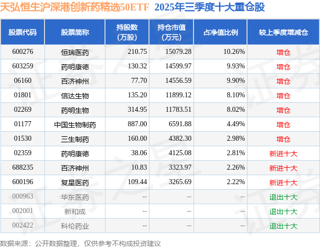 天弘恒生沪深港创新药精选50ETF基金成立于2021年7月27日,基金经理为贺雨轩,基金跟踪标的为恒生沪深港创新药精选50指数,成立以来超额回报为3.97%,近一个月超额回报为0.36%。最新披露的基金持仓数据显示,截止2025年9月30日,该基金第一大重仓股为恒瑞医药(600276),持股占比为10.26%。