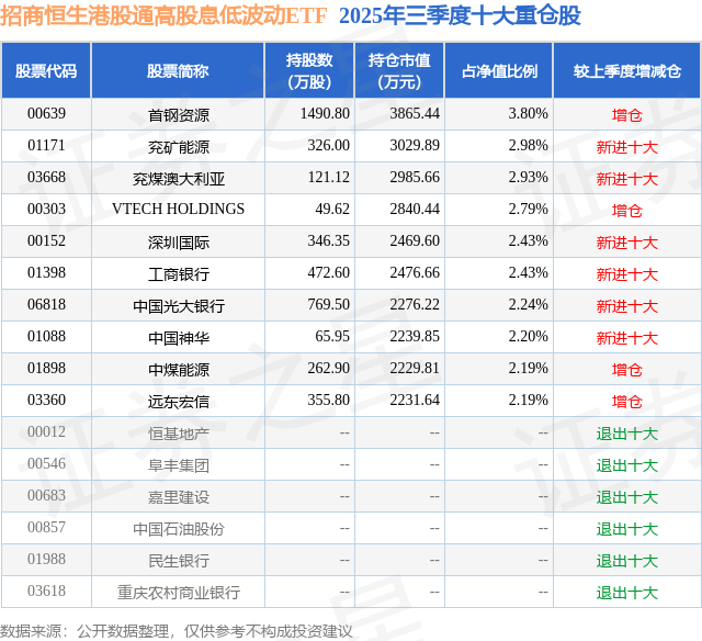 招商恒生港股通高股息低波动ETF基金成立于2025年1月15日,基金经理为许荣漫,基金跟踪标的为恒生港股通高股息低波动指数,成立以来超额回报为-1.31%,近一个月超额回报为0.08%。最新披露的基金持仓数据显示,截止2025年9月30日,该基金第一大重仓股为首钢资源(00639),持股占比为3.8%。