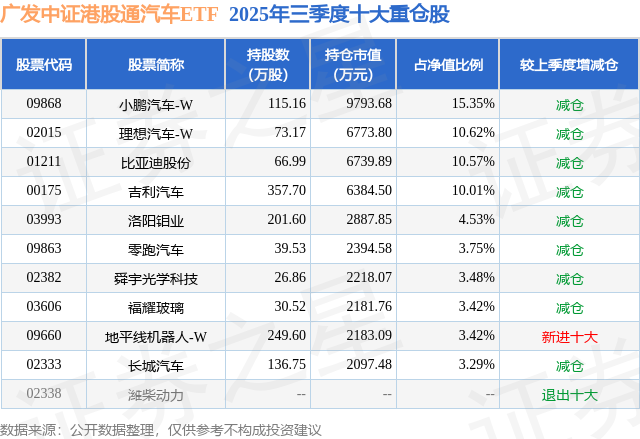 广发中证港股通汽车ETF基金成立于2024年12月19日,基金经理为刘杰,基金跟踪标的为中证港股通汽车产业主题指数,成立以来超额回报为-2.37%,近一个月超额回报为-0.14%。最新披露的基金持仓数据显示,截止2025年9月30日,该基金第一大重仓股为小鹏汽车-W(09868),持股占比为15.35%。