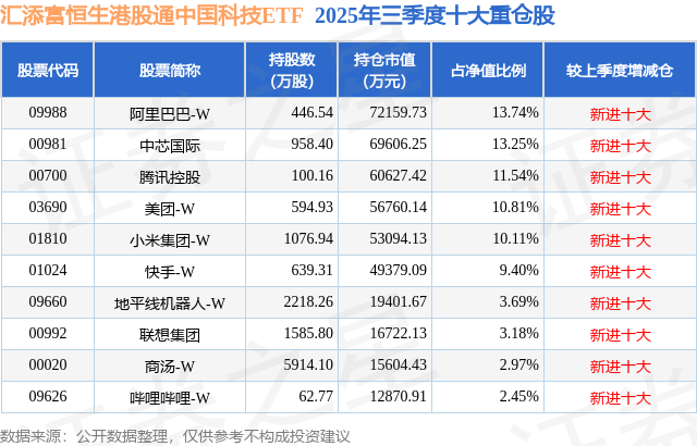 汇添富恒生港股通中国科技ETF基金成立于2025年6月18日,基金经理为乐无穹,基金跟踪标的为恒生港股通中国科技指数,成立以来超额回报为-0.96%,近一个月超额回报为-0.2%。最新披露的基金持仓数据显示,截止2025年9月30日,该基金第一大重仓股为阿里巴巴-W(09988),持股占比为13.74%。