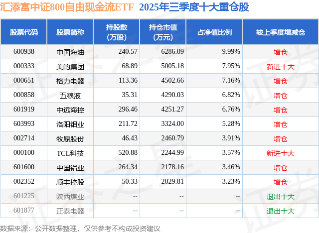 汇添富中证800自由现金流ETF基金成立于2025年4月30日,基金经理为何丽竹,基金跟踪标的为中证800自由现金流指数,成立以来超额回报为2.32%,近一个月超额回报为0.29%。最新披露的基金持仓数据显示,截止2025年9月30日,该基金第一大重仓股为中国海油(600938),持股占比为9.99%。