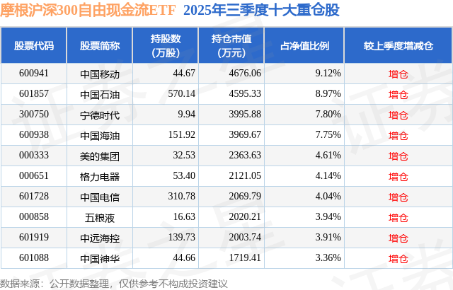摩根沪深300自由现金流ETF基金成立于2025年4月24日,基金经理为曲蕾蕾,基金跟踪标的为沪深300自由现金流指数,成立以来超额回报为3.62%,近一个月超额回报为0.17%。最新披露的基金持仓数据显示,截止2025年9月30日,该基金第一大重仓股为中国移动(600941),持股占比为9.12%。