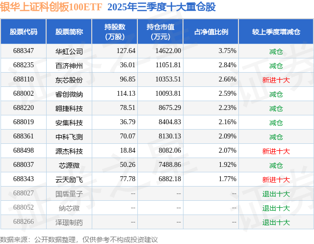 银华上证科创板100ETF基金成立于2023年9月6日,基金经理为马君 张亦驰,基金跟踪标的为上证科创板100指数,成立以来超额回报为-1.12%,近一个月超额回报为0.01%。最新披露的基金持仓数据显示,截止2025年9月30日,该基金第一大重仓股为华虹公司(688347),持股占比为3.75%。