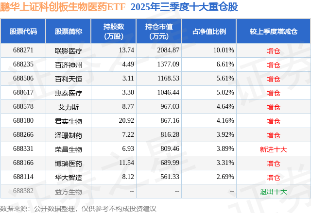 鹏华上证科创板生物医药ETF基金成立于2025年3月12日,基金经理为林嵩,基金跟踪标的为上证科创板生物医药指数,成立以来超额回报为-1.5%,近一个月超额回报为-0.0%。最新披露的基金持仓数据显示,截止2025年9月30日,该基金第一大重仓股为联影医疗(688271),持股占比为10.01%。