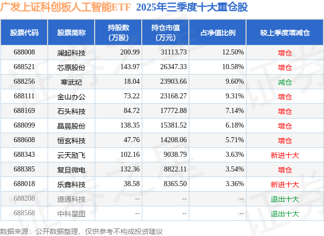 广发上证科创板人工智能ETF基金成立于2025年1月15日,基金经理为曹世宇,基金跟踪标的为上证科创板人工智能指数,成立以来超额回报为-1.09%,近一个月超额回报为0.11%。最新披露的基金持仓数据显示,截止2025年9月30日,该基金第一大重仓股为澜起科技(688008),持股占比为12.5%。