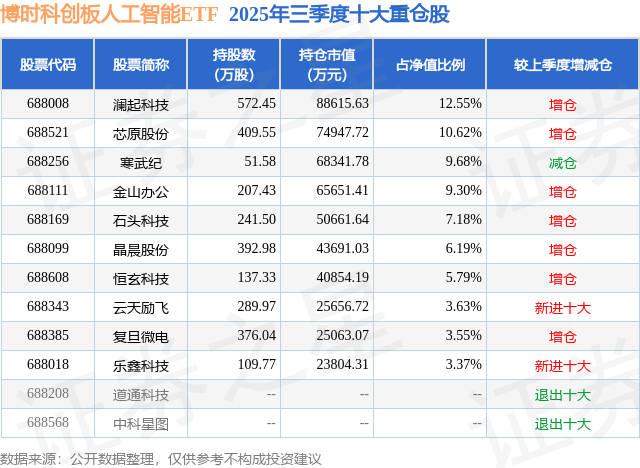博时科创板人工智能ETF基金成立于2024年12月31日,基金经理为李庆阳,基金跟踪标的为上证科创板人工智能指数,成立以来超额回报为11.85%,近一个月超额回报为0.21%。最新披露的基金持仓数据显示,截止2025年9月30日,该基金第一大重仓股为澜起科技(688008),持股占比为12.55%。