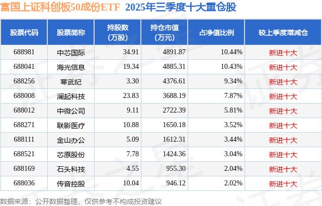 富国上证科创板50成份ETF基金成立于2025年5月21日,基金经理为金泽宇,基金跟踪标的为上证科创板50成份指数,成立以来超额回报为2.97%,近一个月超额回报为0.26%。最新披露的基金持仓数据显示,截止2025年9月30日,该基金第一大重仓股为中芯国际(688981),持股占比为10.44%。