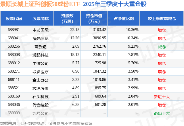 景顺长城上证科创板50成份ETF基金成立于2025年1月15日,基金经理为龚丽丽 金璜,基金跟踪标的为上证科创板50成份指数,成立以来超额回报为1.74%,近一个月超额回报为0.13%。最新披露的基金持仓数据显示,截止2025年9月30日,该基金第一大重仓股为中芯国际(688981),持股占比为10.36%。