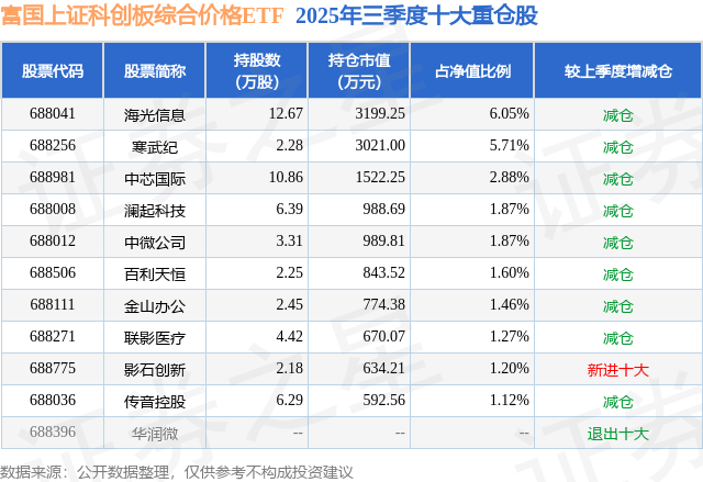 富国上证科创板综合价格ETF基金成立于2025年2月28日,基金经理为金泽宇,基金跟踪标的为上证科创板综合价格指数,成立以来超额回报为2.75%,近一个月超额回报为0.33%。最新披露的基金持仓数据显示,截止2025年9月30日,该基金第一大重仓股为海光信息(688041),持股占比为6.05%。