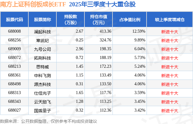 南方上证科创板成长ETF基金成立于2025年5月21日,基金经理为杨恺宁,基金跟踪标的为上证科创板成长指数,成立以来超额回报为-1.96%,近一个月超额回报为-0.26%。最新披露的基金持仓数据显示,截止2025年9月30日,该基金第一大重仓股为澜起科技(688008),持股占比为12.59%。