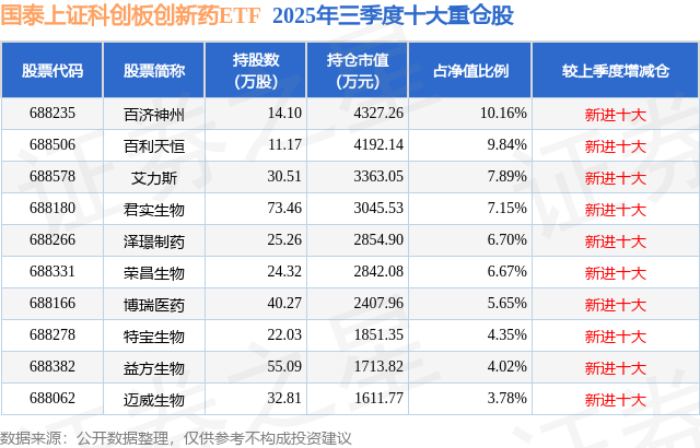 国泰上证科创板创新药ETF基金成立于2025年7月23日,基金经理为麻绎文,基金跟踪标的为上证科创板创新药指数,成立以来超额回报为-2.15%,近一个月超额回报为0.22%。最新披露的基金持仓数据显示,截止2025年9月30日,该基金第一大重仓股为百济神州(688235),持股占比为10.16%。