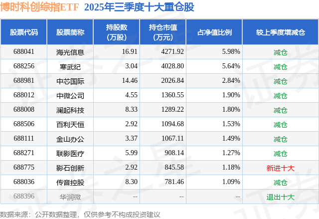博时科创综指ETF基金成立于2025年2月26日,基金经理为刘玉强,基金跟踪标的为上证科创板综合指数,成立以来超额回报为1.01%,近一个月超额回报为0.12%。最新披露的基金持仓数据显示,截止2025年9月30日,该基金第一大重仓股为海光信息(688041),持股占比为5.98%。