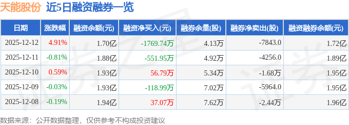 证券之星消息,截至2025年12月12日收盘,天能股份(688819)报收于33.57元,上涨4.91%,换手率0.69%,成交量6.7万手,成交额2.22亿元。