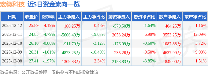 证券之星消息,截至2025年12月12日收盘,宏微科技(688711)报收于25.89元,上涨4.19%,换手率6.37%,成交量13.57万手,成交额3.48亿元。