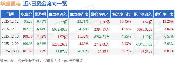 证券之星消息,截至2025年12月12日收盘,华盛锂电(688353)报收于95.23元,下跌6.73%,换手率9.92%,成交量11.81万手,成交额11.46亿元。