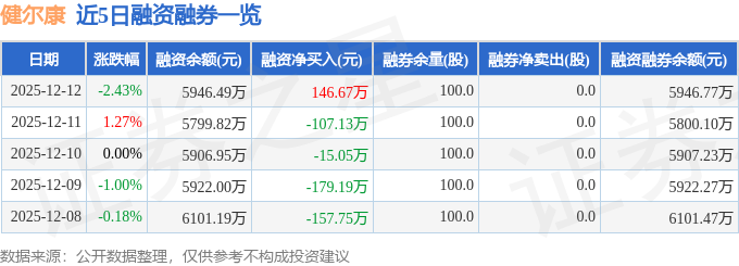 健尔康融资融券信息显示,融资方面,当日融资买入255.94万元,融资偿还109.27万元,融资净买入146.67万元。融券方面,融券卖出0.0股,融券偿还0.0股,融券余量100.0股,融券余额0.27万元。融资融券余额5946.77万元。