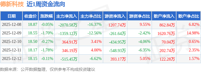 资金流向数据方面,本周德新科技主力资金合计净流出3234.04万元,游资资金合计净流入355.38万元,散户资金合计净流入2878.66万元。本周资金流向一览见下表: