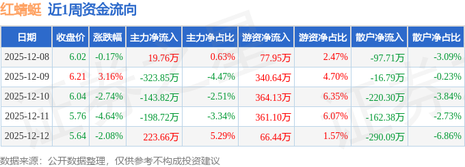 资金流向数据方面,本周红蜻蜓主力资金合计净流出422.97万元,游资资金合计净流入1210.26万元,散户资金合计净流出787.29万元。本周资金流向一览见下表: