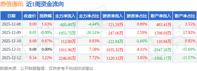 资金流向数据方面,本周鼎信通讯主力资金合计净流入1709.26万元,游资资金合计净流入2301.25万元,散户资金合计净流出4010.52万元。本周资金流向一览见下表: