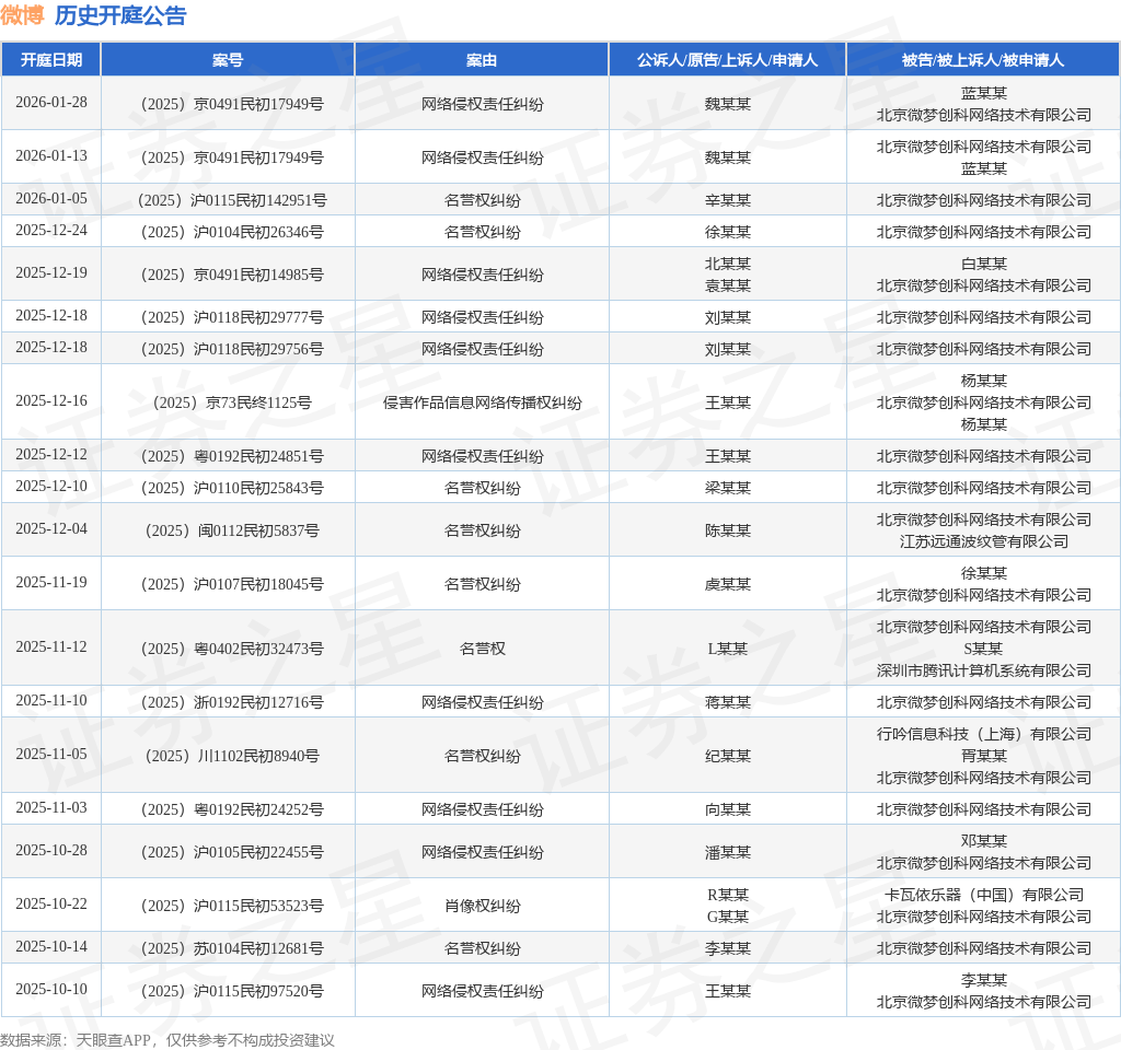 案号:(2025)京73民终1125号根据统计,近一年内以北京微梦创科网络技术有限公司为当事人的历史开庭公告有144则,其中案由为“网络侵权责任纠纷”的公告以57则居首,其次为“名誉权纠纷”有49则,“侵害作品信息网络传播权纠纷”有9则。历史开庭公告(前20条)如下: