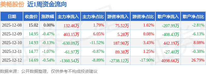 资金流向数据方面,本周美畅股份主力资金合计净流出1516.99万元,游资资金合计净流出2380.04万元,散户资金合计净流入3897.03万元。本周资金流向一览见下表: