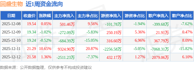 资金流向数据方面,本周回盛生物主力资金合计净流入6358.64万元,游资资金合计净流出1359.41万元,散户资金合计净流出4999.23万元。本周资金流向一览见下表: