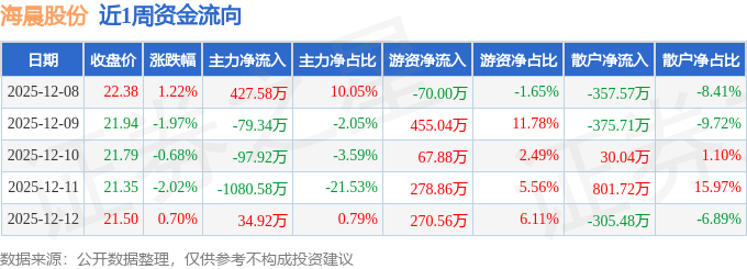 资金流向数据方面,本周海晨股份主力资金合计净流出795.33万元,游资资金合计净流入1002.33万元,散户资金合计净流出207.0万元。本周资金流向一览见下表: