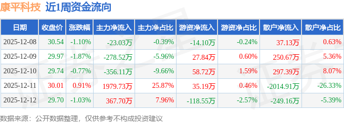 资金流向数据方面,本周康平科技主力资金合计净流入1689.77万元,游资资金合计净流出10.89万元,散户资金合计净流出1678.87万元。本周资金流向一览见下表:
