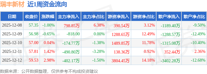 资金流向数据方面,本周瑞丰新材主力资金合计净流出268.97万元,游资资金合计净流入7111.85万元,散户资金合计净流出6842.88万元。本周资金流向一览见下表: