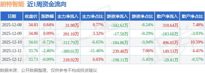资金流向数据方面,本周朗特智能主力资金合计净流出248.81万元,游资资金合计净流出503.61万元,散户资金合计净流入752.42万元。本周资金流向一览见下表:
