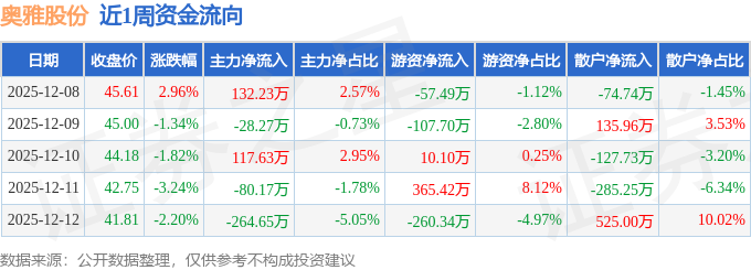 资金流向数据方面,本周奥雅股份主力资金合计净流出123.22万元,游资资金合计净流出50.02万元,散户资金合计净流入173.23万元。本周资金流向一览见下表: