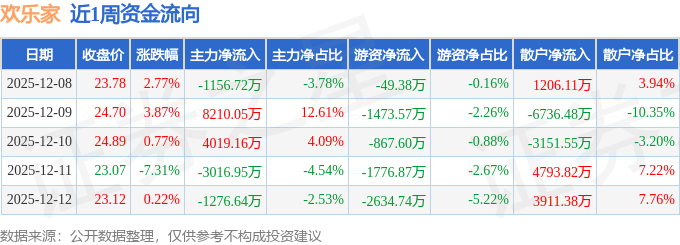 资金流向数据方面,本周欢乐家主力资金合计净流入6778.89万元,游资资金合计净流出6802.16万元,散户资金合计净流入23.28万元。本周资金流向一览见下表: