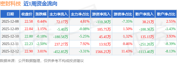 资金流向数据方面,本周密封科技主力资金合计净流出329.4万元,游资资金合计净流入1621.0万元,散户资金合计净流出1291.6万元。本周资金流向一览见下表: