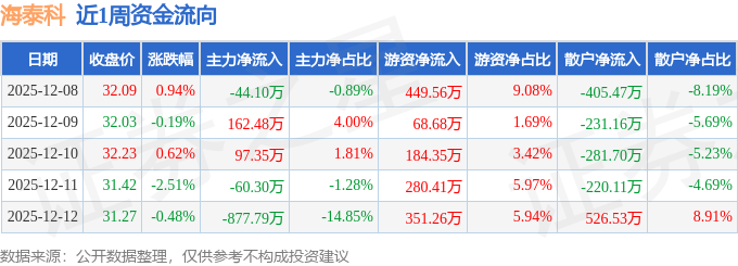 资金流向数据方面,本周海泰科主力资金合计净流出722.36万元,游资资金合计净流入1334.27万元,散户资金合计净流出611.91万元。本周资金流向一览见下表:
