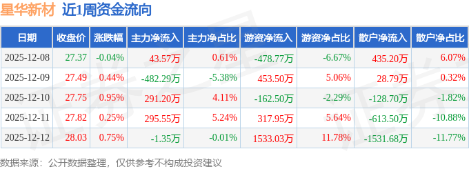 资金流向数据方面,本周星华新材主力资金合计净流入146.69万元,游资资金合计净流入1663.21万元,散户资金合计净流出1809.9万元。本周资金流向一览见下表: