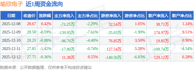 资金流向数据方面,本周瑜欣电子主力资金合计净流出314.32万元,游资资金合计净流入61.41万元,散户资金合计净流入252.91万元。本周资金流向一览见下表: